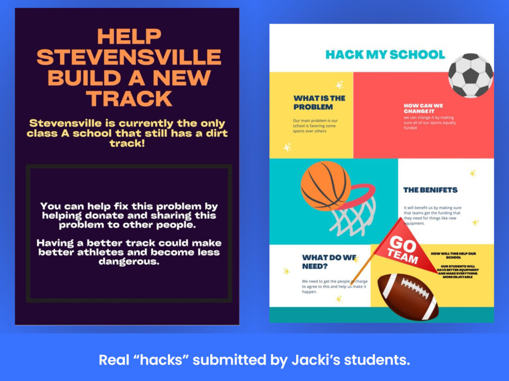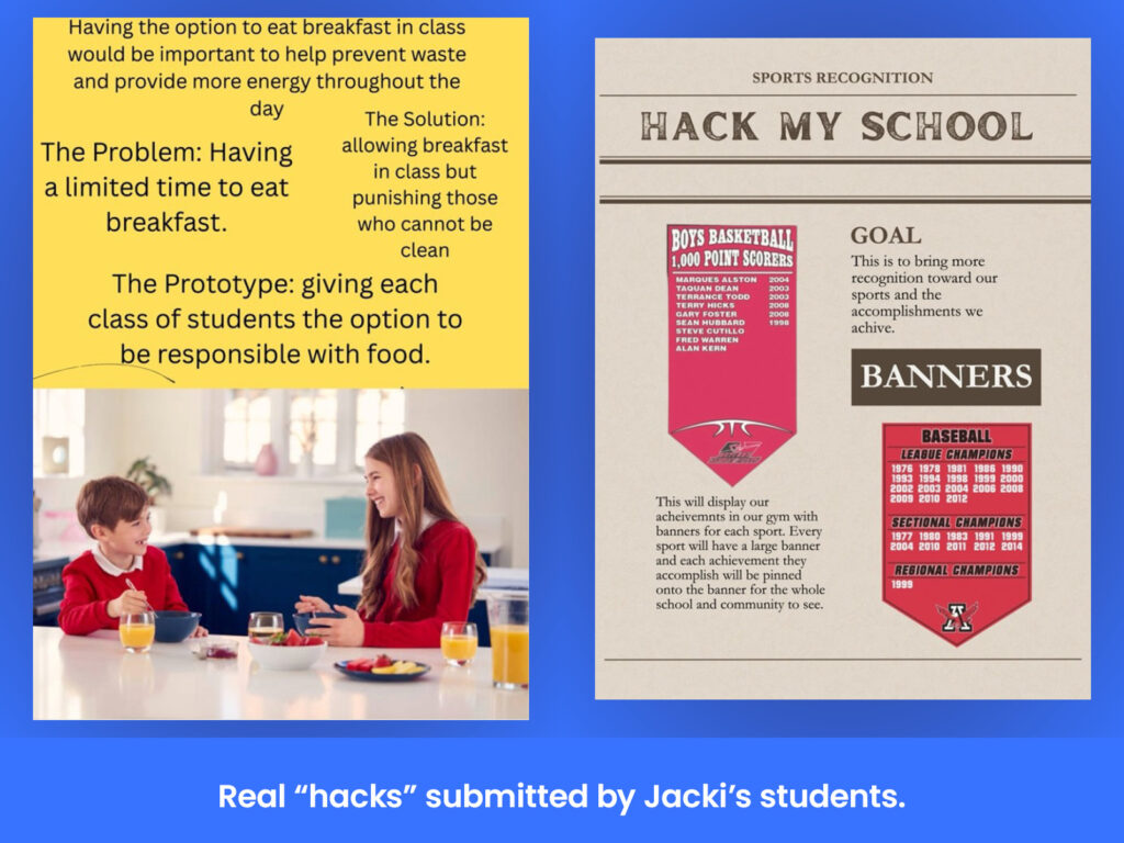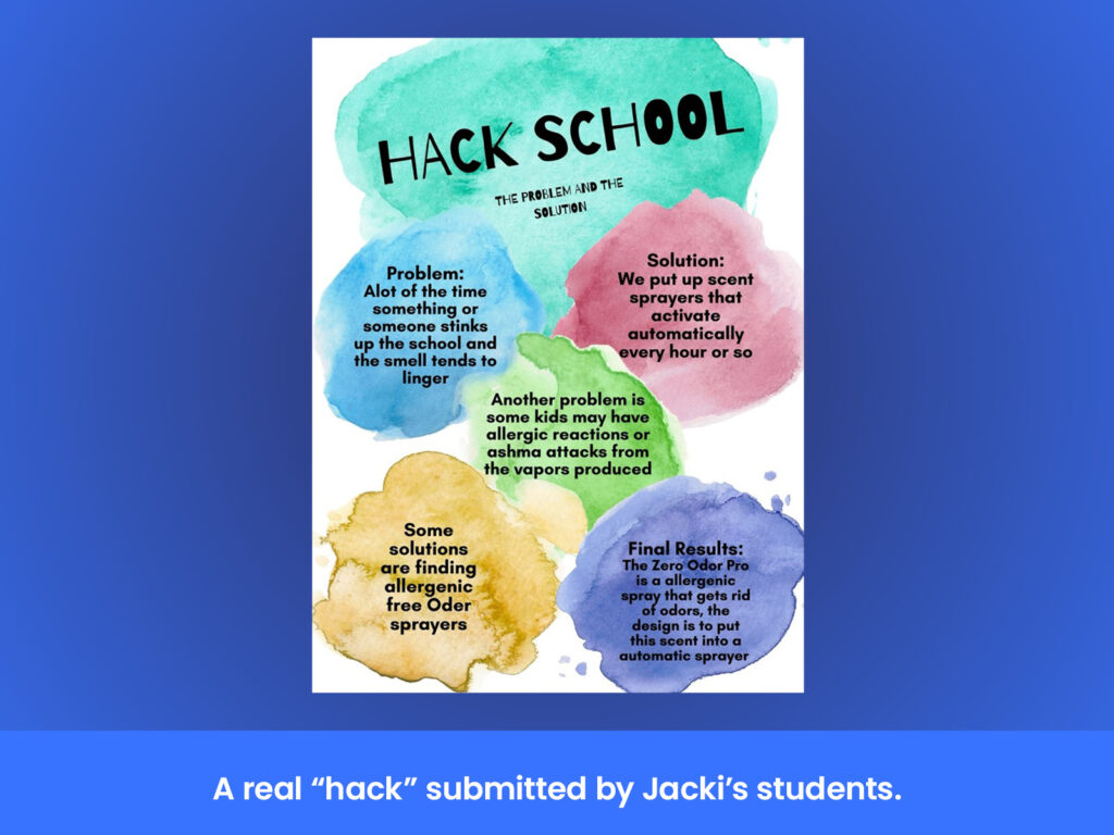 Through Hack My School, Jacki’s students practice empathy and problem-solving on their own campus. By surveying classmates, identifying needs, and brainstorming improvements, they generate ideas for productive change while learning how entrepreneurs think about customers.