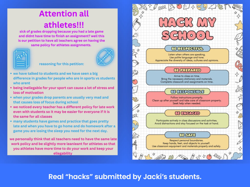 Hack My School gives students the chance to take real ownership of their learning and their environment. Like Jacki’s students, they get to see that their ideas matter – and change can start with them. Invite your students to choose their own path by identifying a problem worth solving and designing a solution that makes school better for everyone. Students who feel empowered to take action don’t just learn – they own their learning.