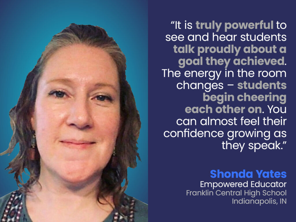 Shonda begins each school year with “strengths and skills discovery” because she believes every student deserves to see evidence of their own value early and often. “This activity is the first step in building students’ confidence to clearly communicate their strengths – whether in an interview, a team meeting, or any professional setting,” says Shonda. “It is truly powerful to see and hear students talk proudly about a goal they achieved. The energy in the room changes – students begin cheering each other on. You can almost feel their confidence growing as they speak.” More tips from Shonda: